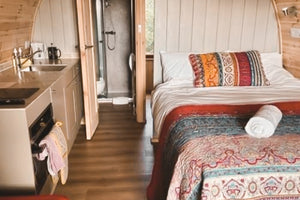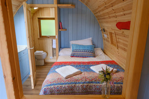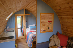 Our ‘Honeymoon” Pod is our only two sleeper featuring a king size bed, you can wake up looking over the fields and go to sleep seeing the stars.